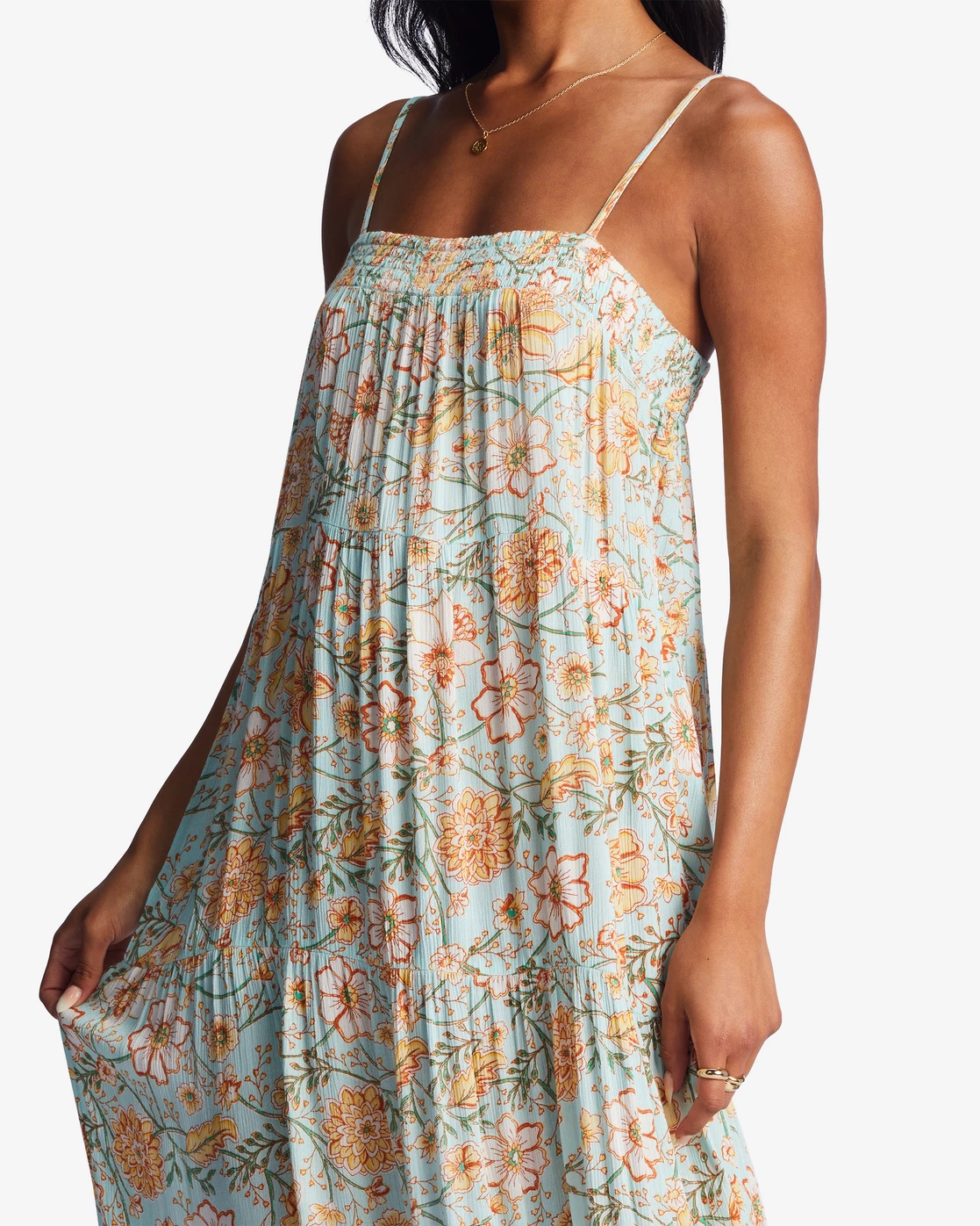 Made of airy crinkle fabric, this printed maxi dress has a floaty shape styled with a tiered ruffle skirt and thin straps. A perfect look for your next beach picnic.