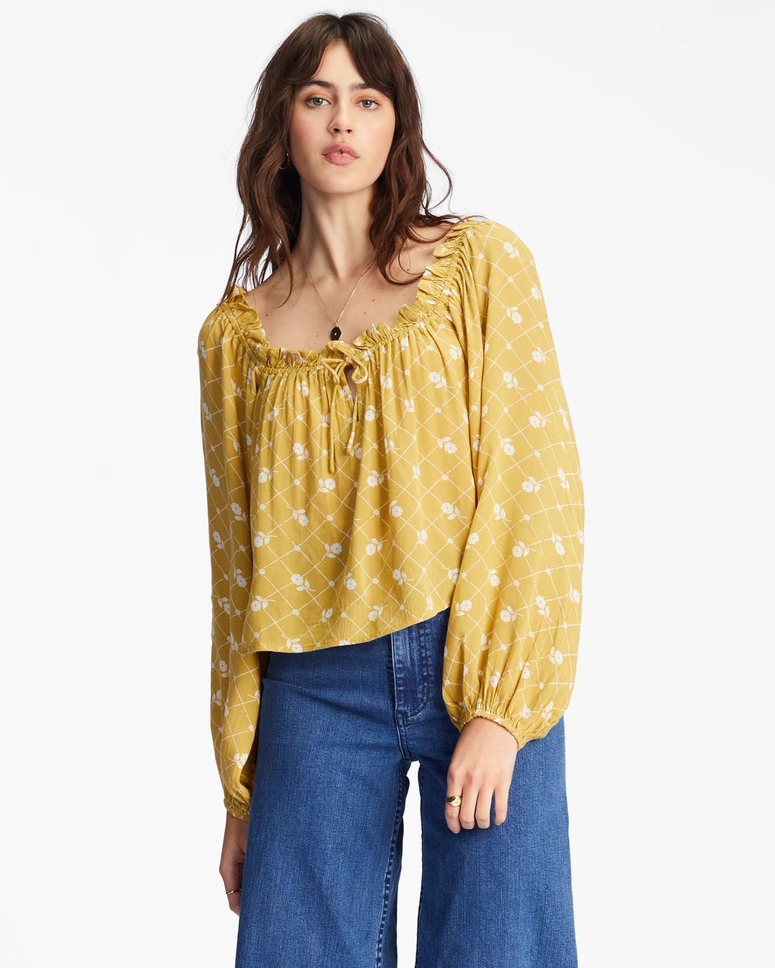 Loose and laid-back, the Fall In Love top is a timeless style with bohemian flair. This women’s long sleeve blouse from the Magic Hour collection is made of soft crinkle fabric offering a flowy fit with long blouson sleeves and a ruffled neckline with a front tie.