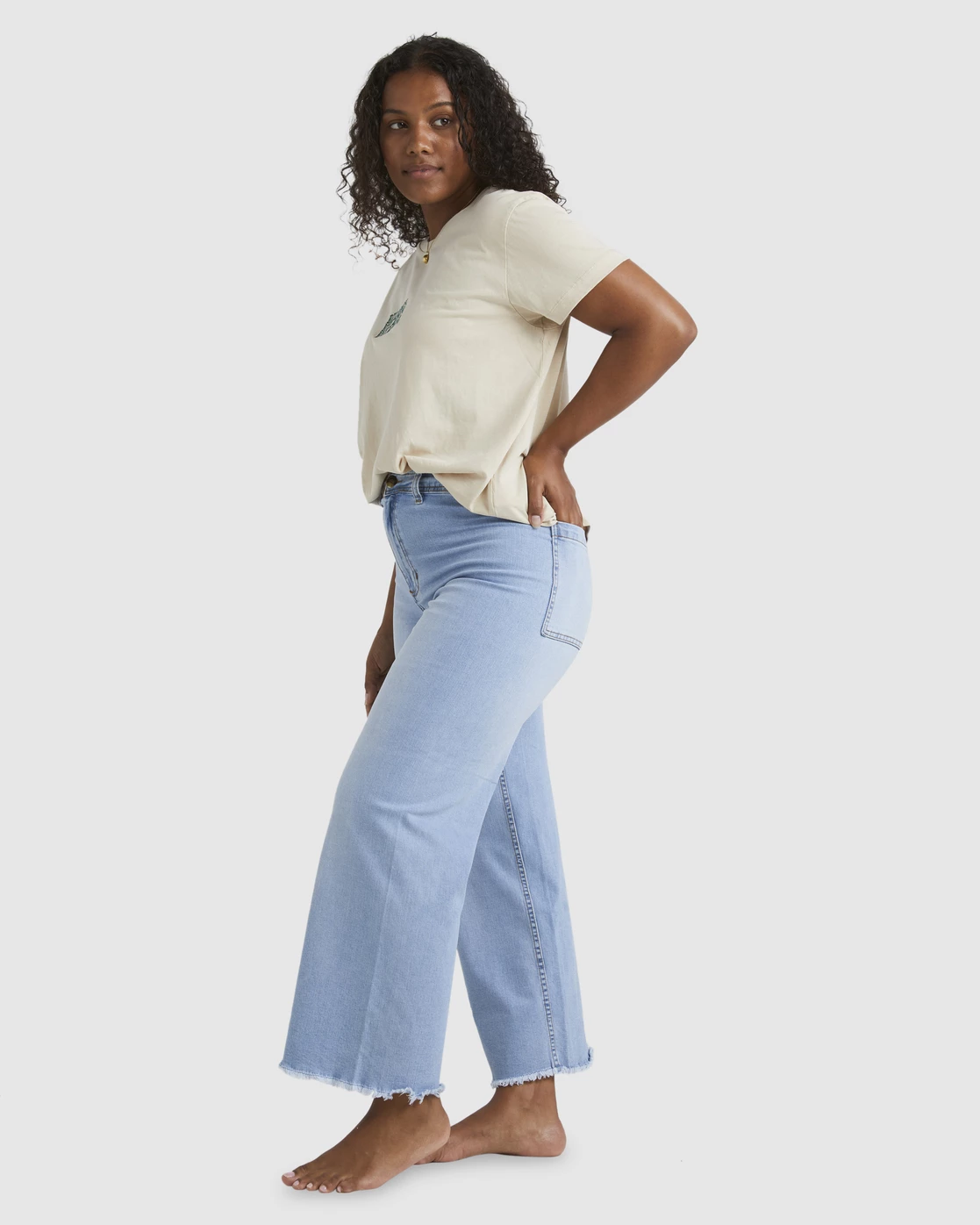 The Free Fall Indigo pant pairs a waist-accentuating high rise with a cool, wide leg. Made with blended cotton, the Essentials collection pant is fitted and flattering through the hips, with button-fly closure, a raw hem, and just enough stretch to keep them all-day comfy.