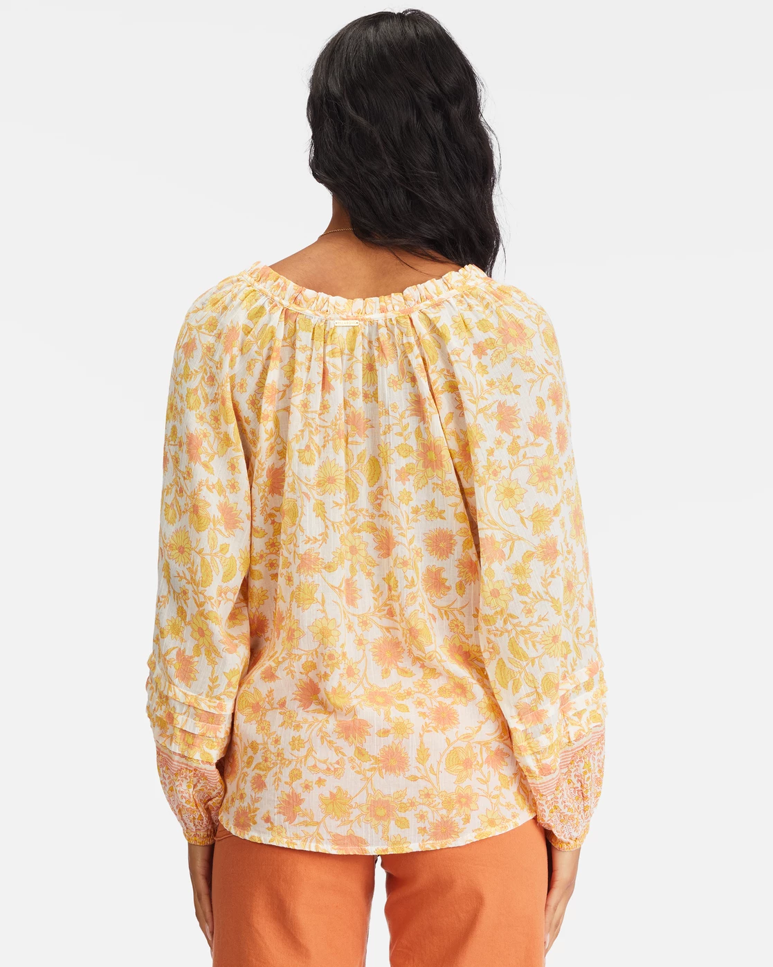 - Contrast print at sleeves with pintuck details.