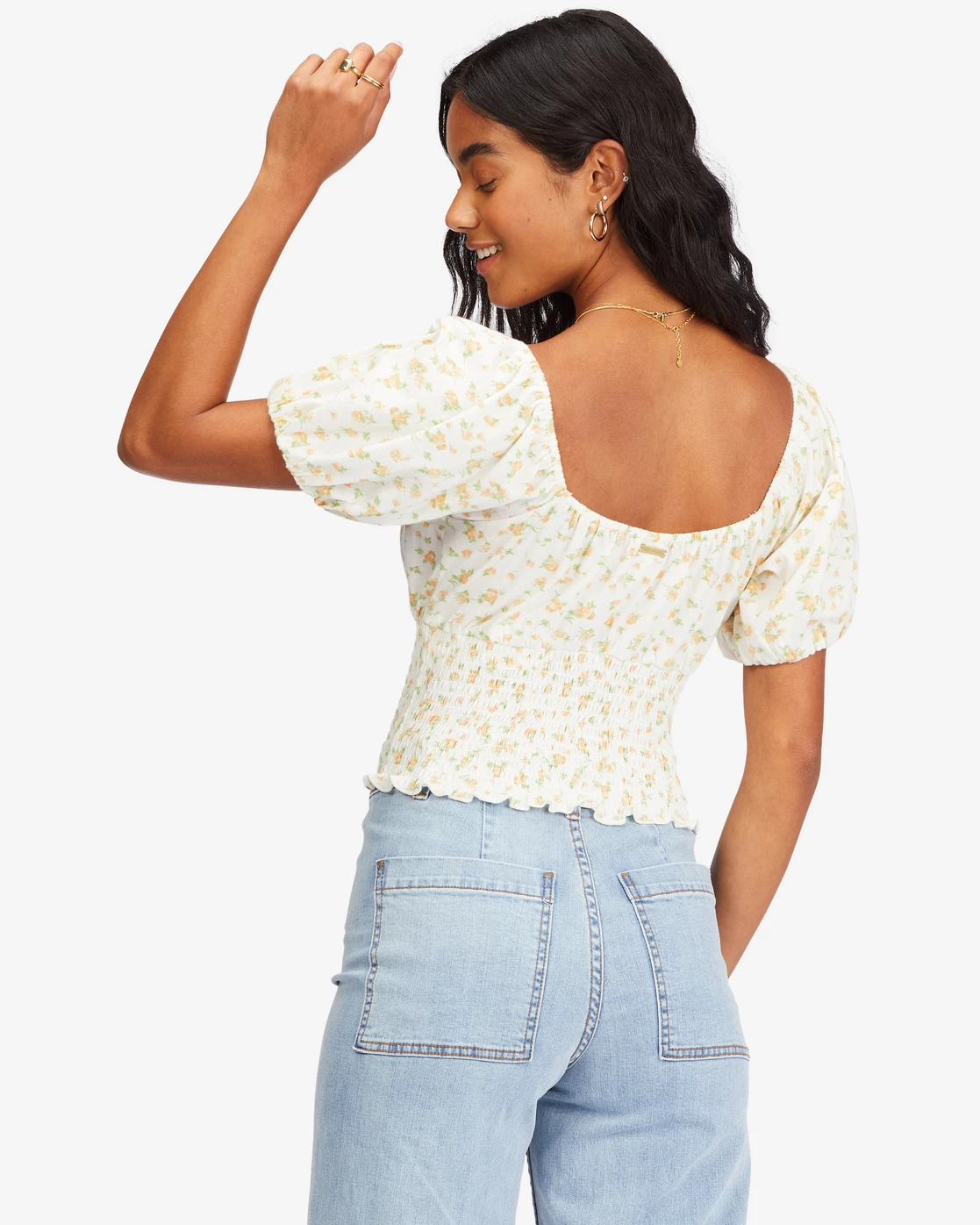 The Get Along top is a modern take on a classic peasant top. Made with cotton jersey, this floral top from our Sol Chasin collection has a lightweight and breathable feel, plus cute puff sleeves and fitted waist that contours to your shape with a stretchy smocked design.