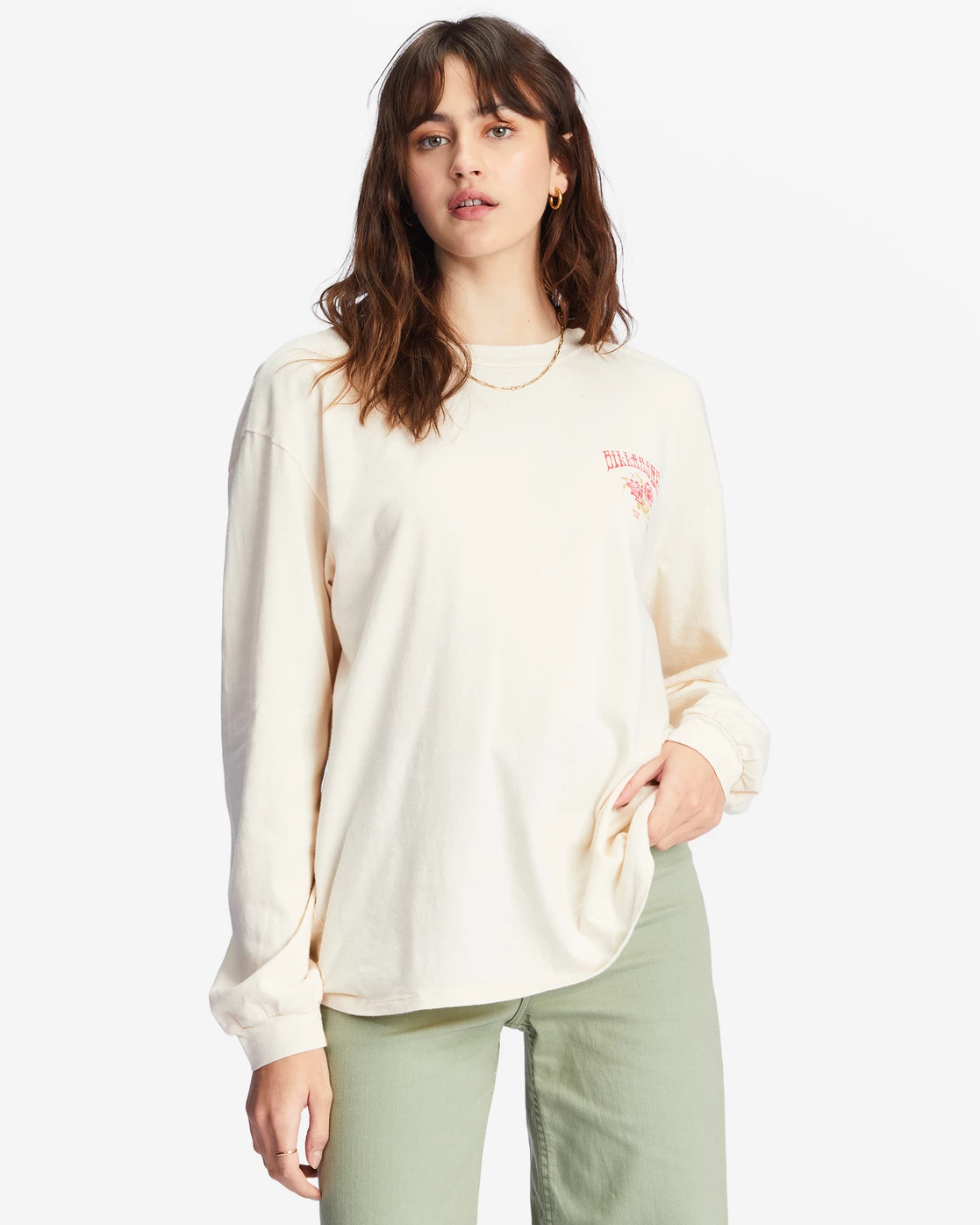 Tough on the outside, but she’s a gentle soul at heart. Find your footing in the Handle With Care Long Sleeve Graphic Boyfriend T-Shirt. Made of loose-knit cotton jersey, this long-sleeve crewneck tee offers a cool oversized fit and custom screen print graphics.