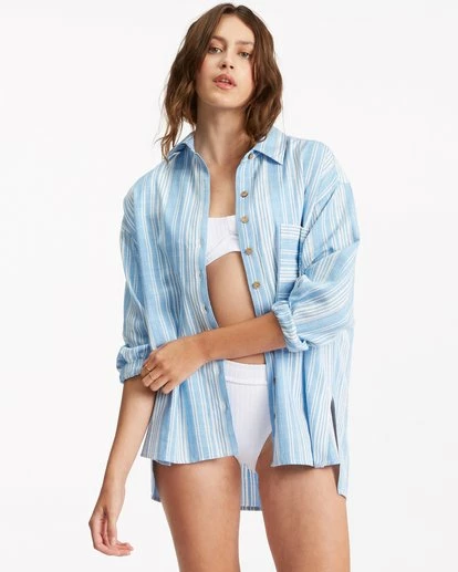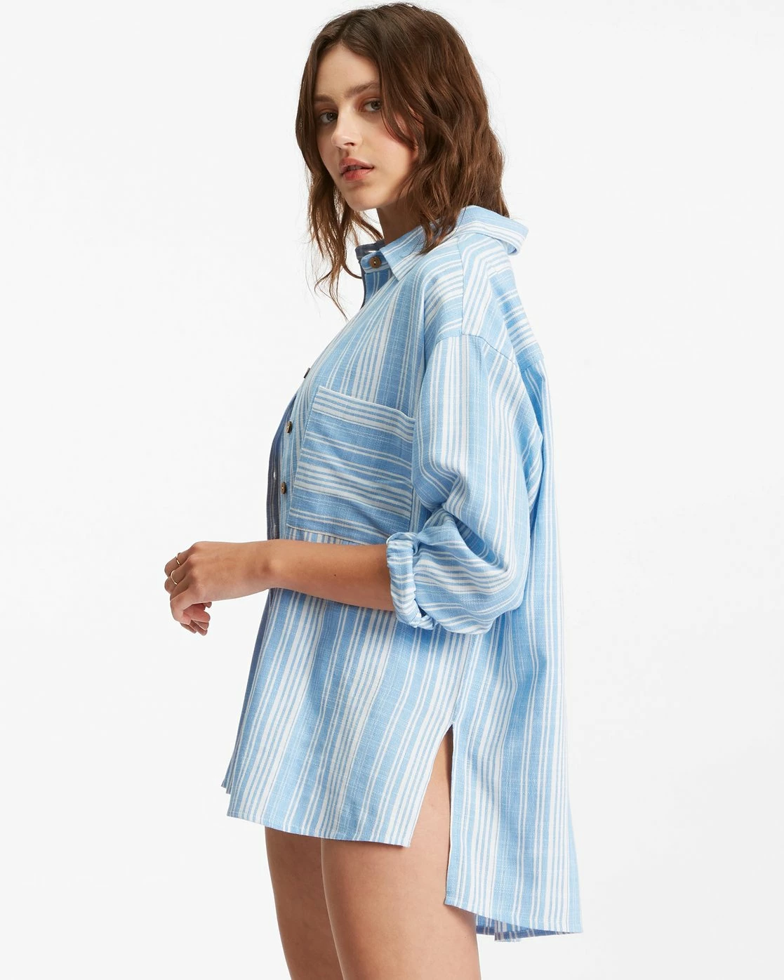 A laid-back button-down worthy of a stroll along the shore— the In The Tide long-sleeve shirt from The Sea And Me collection features a sunbaked stripe print, an oversized shape with a patch pocket, and cotton-viscose slub fabric that keeps it feeling ultra-lightweight and comfortable.