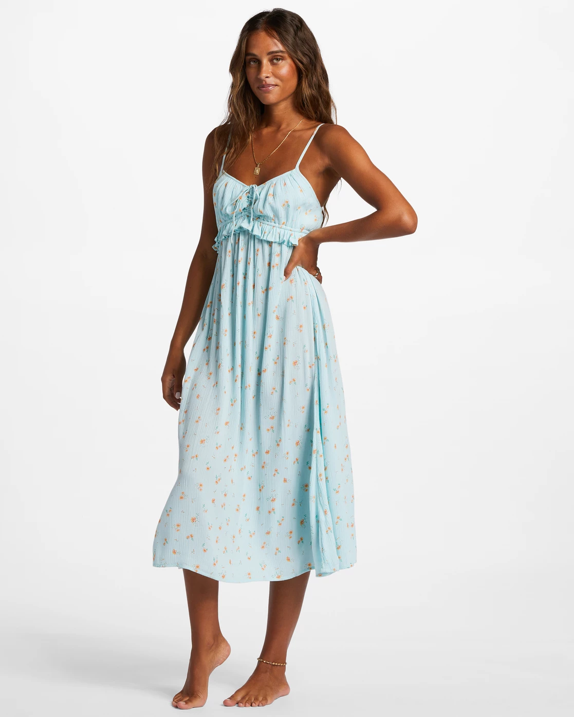 Made in airy crinkle fabric, this printed midi dress updates a timeless slip silhouette with a ruffled empire waistline and a tie at the chest.