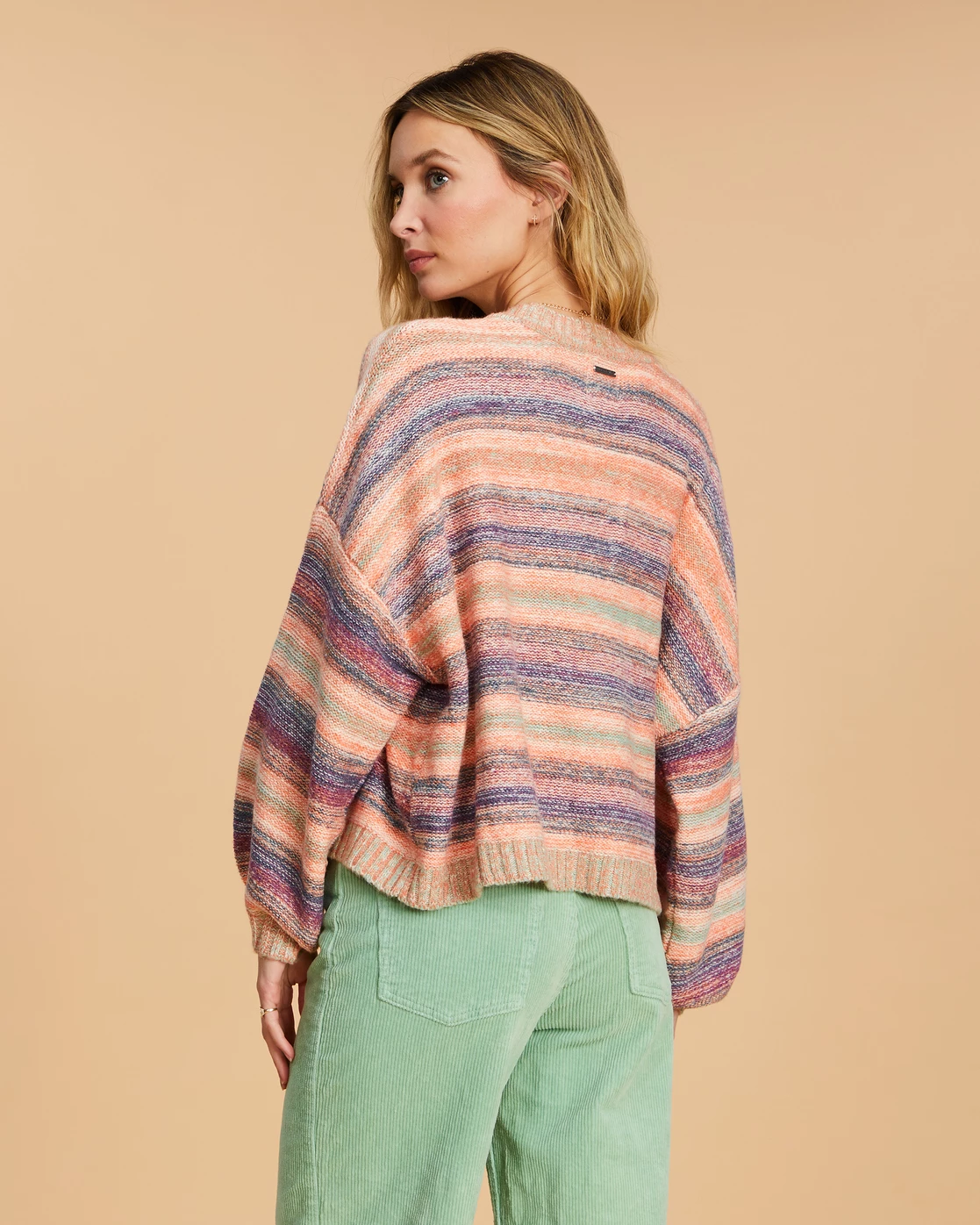Made with soft recycled yarn, the Salty Blonde Under The Influence sweater takes a classic crewneck pullover and gives it a contemporary twist with oversized balloon sleeves and a bold stripe. The relaxed shape is perfect for tossing over your bikini or cropped tee— a golden hour go-to.