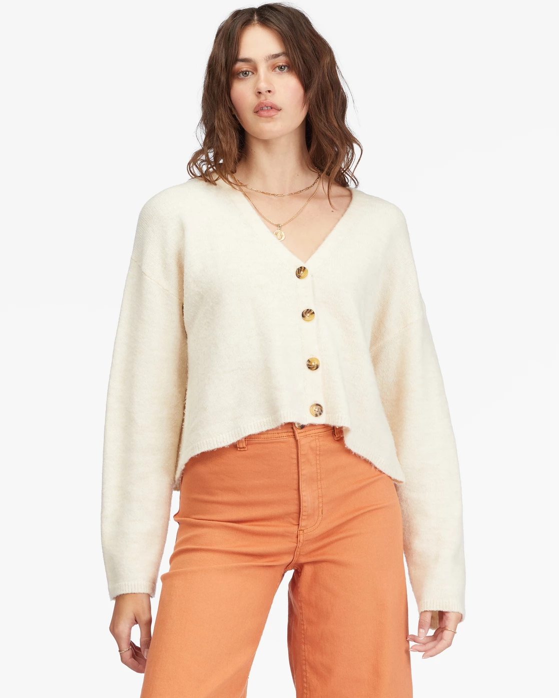 A modern take on a vintage grandpa cardigan, the Short N Sweet sweater from our Rising Wild collection contrasts an relaxed fit with a cropped length, and a lush knit with large faux horn buttons. Looks particularly cool with high-waisted bottoms or layered over a fitted dress.