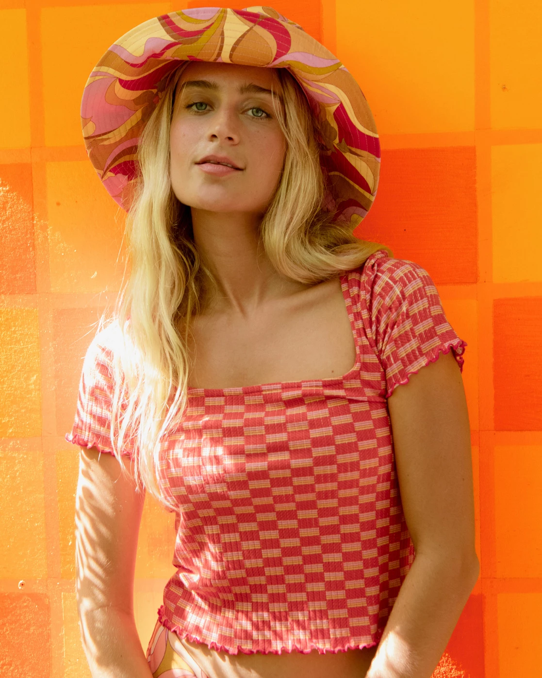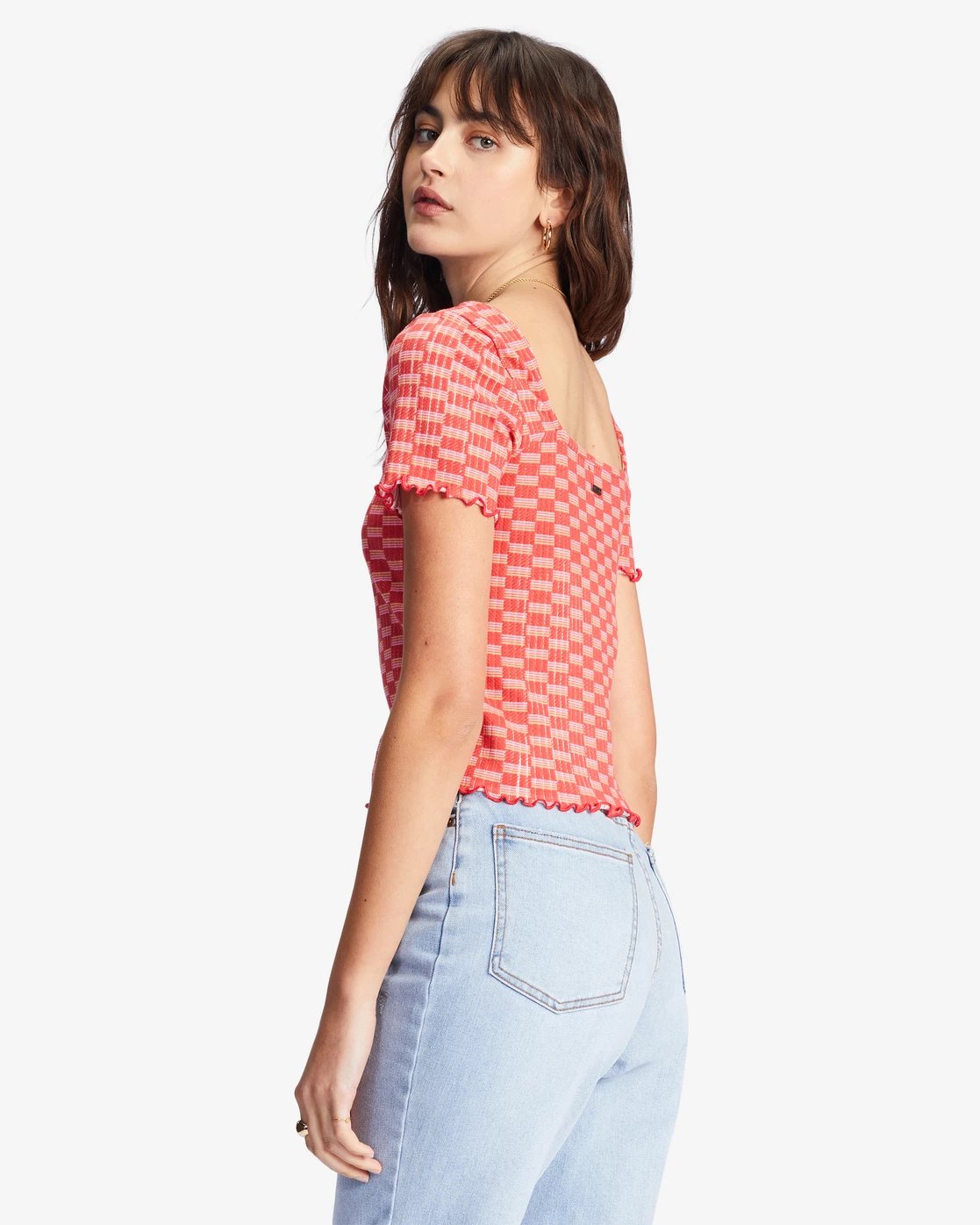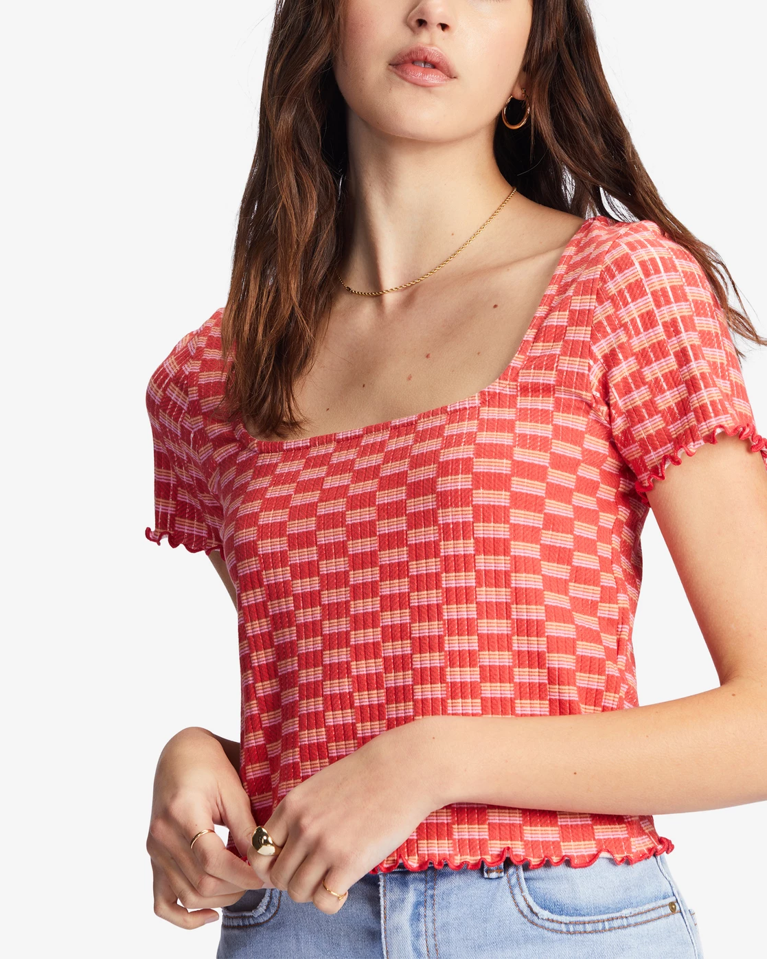 The Squared Away Knit Top from our Castles In The Sand collection is an everyday staple with a groovy spirit. Made in a soft ribbed knit, this women’s bodycon top features a retro checker print, a scoop neck, and baby ruffles at the hem.
