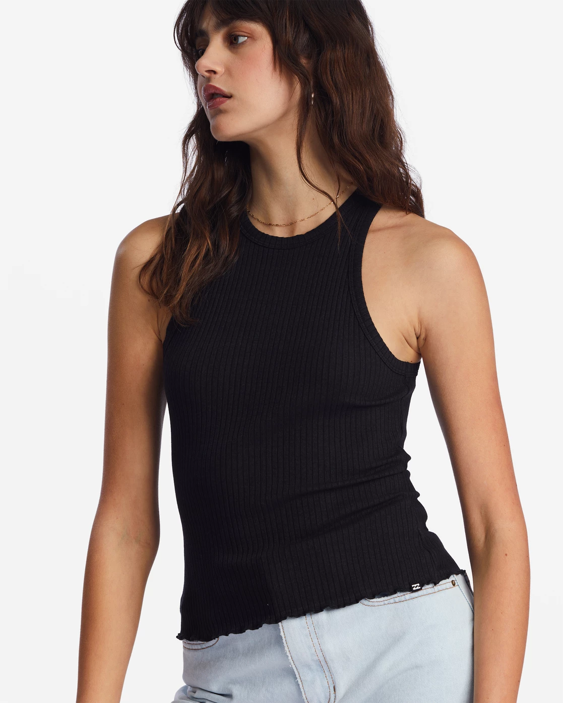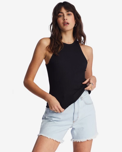With rib knit lines borrowed from the boys, the Tomboy Tank Top takes owns its feminine side with a fitted shape and ruffle hem. An everyday essential, the women’s tank top adds a modern high neckline to the rib knit staple.